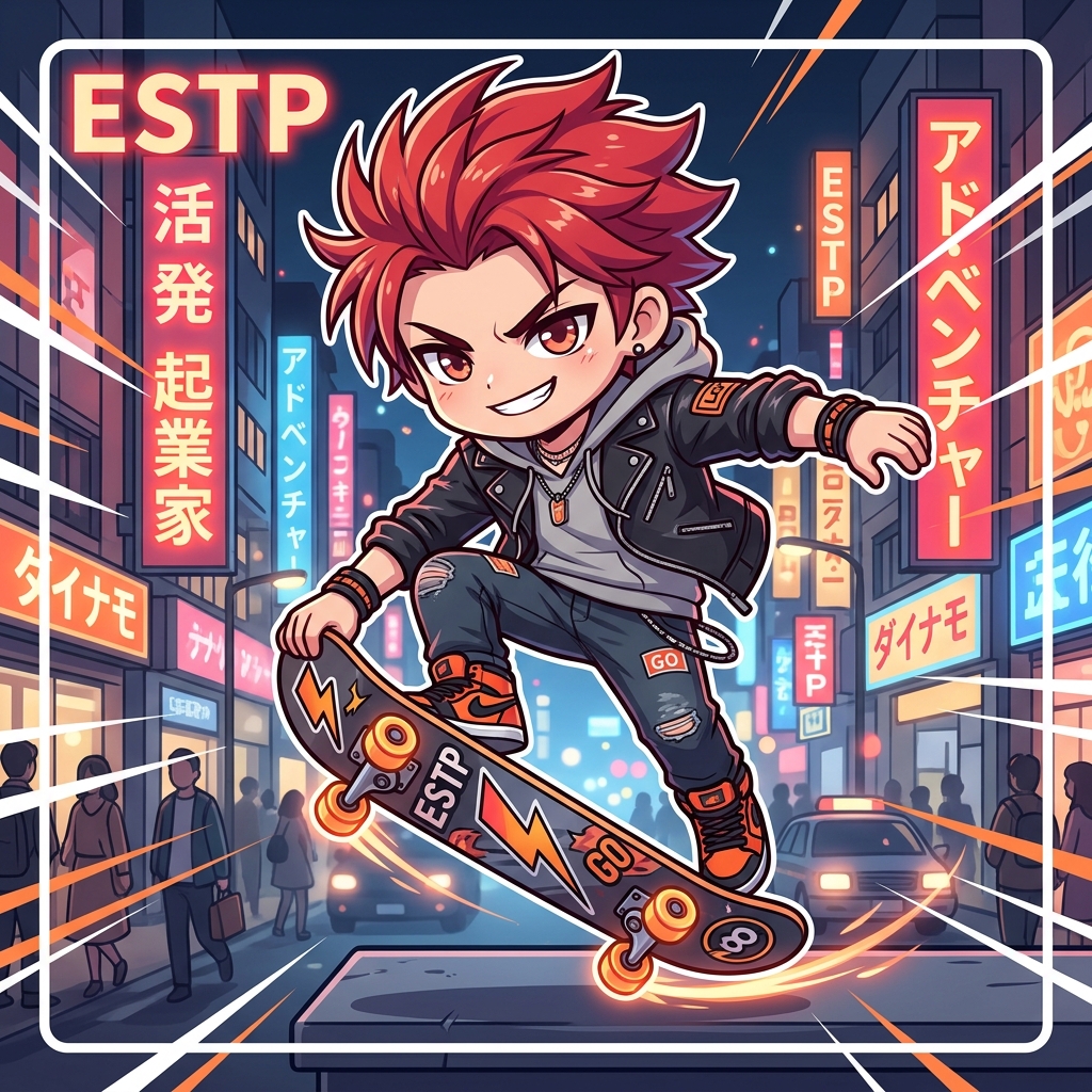 ESTP 是行走的肾上腺素——永远在追寻下一个刺激、下一个挑战、下一个'不可能完成的任务'。你们反应极快、适应力极强,是危机时刻最靠得住的伙伴。ESTP 不做PPT,你们直接上场表演。人生对你来说就是一场大型真人秀,而你总是那个最精彩的选手。你的人生哲学:想太多不如直接干。